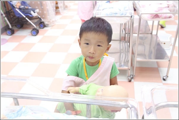 弟弟則在隔壁體驗護士照顧小Baby,